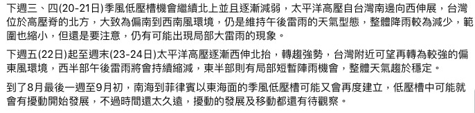 吳聖宇提醒,下週三、四 (20至21日) 季風低壓槽機會繼續北上並且逐漸減弱,太平洋高壓自台灣南邊向西伸展,台灣位於高壓脊的北方,大致為偏南到西南風環境,仍是維持午後雷雨的天氣型態,整體降雨較為減少,範圍縮小,但仍有可能出現局部大雷雨的現象;下週五 (22日) 起至下週末 (23至24日) 太平洋高壓逐漸西伸北抬,轉趨強勢,可望再轉為較強的偏東風環境,西半部午後雷雨將會持續縮減,東半部則有局部短暫陣雨機會,天氣趨於穩定。