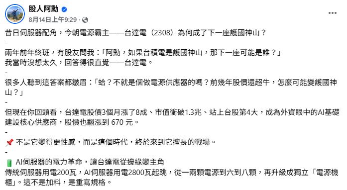 另外,台達電早在20年前就推出為資料中心客製整組散熱與電源方案,使得它一腳跨進AI伺服器內部核心架構,目前電源、散熱市佔全球第一,從零件廠變成規格制定者與關鍵供應者。「股人阿勳」認為台達電股價起飛不是短期炒作,而是花了40年打造的底層實力,與剛好碰上AI產業用電暴衝的風口,是「慢慢醞釀的結構性贏家」。