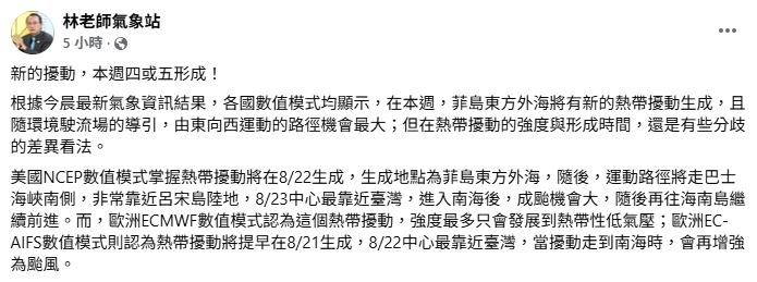 至於颱風動態,氣象專家林得恩在臉書粉專「林老師氣象站」分析表示,菲律賓東方外海在明 (21)、後 (22) 天很可能會有新的擾動形成,且各國數值模式均顯示,該熱帶系統「由東向西」運動的路徑機會最大,只是強度和生成時間目前仍有歧異。