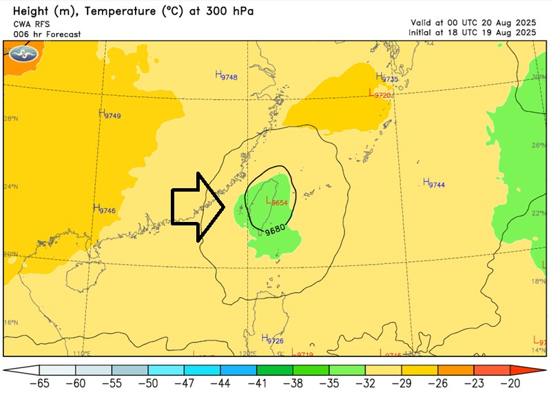 台灣上空出現「高層冷心低壓」!前氣象局長鄭明典今早 (20) 表示:「高層冷心低壓移入,高層變冷,上面空氣變重,頭重腳輕會增加對流不穩定度。不過因為大環境太平洋高壓偏強,低層稍偏乾,有抑制對流的趨勢,所以會使高層冷心低壓的作用打點折扣!」
