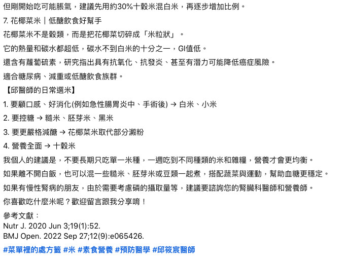 最後,邱筱宸建議,不要長期只吃單一米種,一週吃到不同種類的米和雜糧,營養才會更均衡,若離不開白飯,也可以混一些糙米、胚芽米或豆類一起煮,搭配蔬菜與運動,幫助血糖更穩定;有慢性腎病的朋友,由於需要考慮磷的攝取量等,建議諮詢腎臟科醫師和營養師。