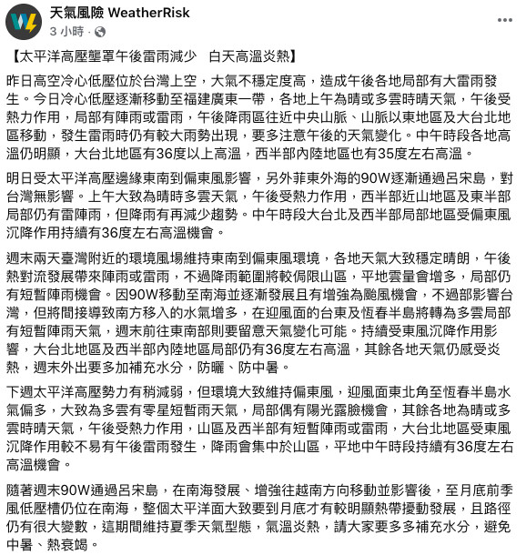 最後,「天氣風險 WeatherRisk」強調,隨著週末90W通過呂宋島,在南海發展、增強往越南方向移動並影響後,至月底前季風低壓槽仍位在南海,整個太平洋面大致要到月底,才有較明顯熱帶擾動發展,且路徑仍有很大變數,這期間維持夏季天氣型態,氣溫炎熱。