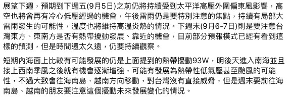 關於颱風部分,氣象粉專「天氣風險公司」也在臉書分析,短期內海面上較有可能發展的仍是熱帶擾動93W,明 (28) 、後 (29) 天進入南海,且接上西南季風之後,就有機會逐漸增強,可能有發展為熱帶性低氣壓甚至颱風的可能性,大致會往海南島、越南方向移動,「對台灣沒有直接威脅」,但週末要前往海南島、越南的朋友,要注意這個擾動未來發展變化的情況。