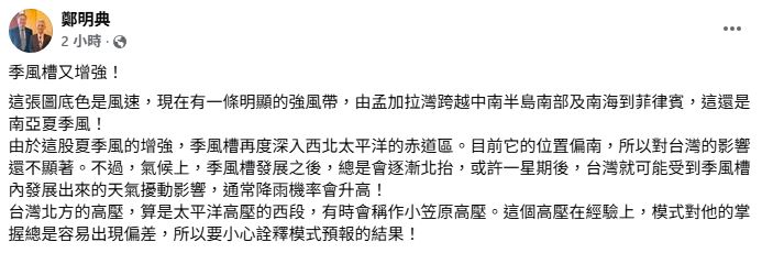 前气象局长郑明典则在脸书分析表示,目前有一条明显的强风带,由孟加拉湾跨越中南半岛南部及南海到菲律宾,由于这股南亚夏季风的增强,使得季风槽深入西北太平洋的赤道区、位置偏南,因此现阶段对台湾的影响还不明显。