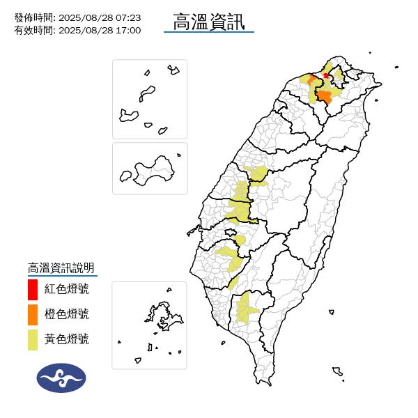 根据媒体《TVBS》、《自由时报》的报导,中央气象署指出,台湾今 (28) 日天气依旧高温炎热,各地普遍高温都有32度以上,桃园以北及中南部近山区温度甚至会更高一些,且中午前后紫外线强劲,外出务必做好防晒、预防中暑。中南部及北部山区则要留意午后有较大雨势的局部短暂雷阵雨。