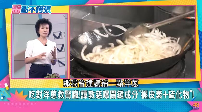 譚敦慈解釋,洋蔥含有硫化物與槲皮素等抗氧化成分,不僅能協助腎臟健康,還可輔助降血糖,腎功能不佳或糖尿病患者可以適量食用,對腎臟及血糖調節皆具正面效果。營養師高敏敏也表示,洋蔥因富含異蒜氨酸與膳食纖維,還能減緩過敏反應、抗發炎、維持腸道健康,甚至遏止癌細胞生長。