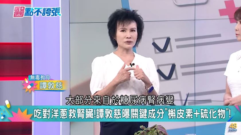 譚敦慈在網路節目《醫點不誇張》中指出,台灣洗腎人口居高不下的原因,不少民眾都以為是黑心食品或吃太鹹所致,但其實多來自糖尿病所導致的腎病變。這類患者因長期血糖控制不佳,以致腎功能退化,她因此建議國人平時除了多喝水、避免高油高鹽高糖飲食,還可多食用「洋蔥」。