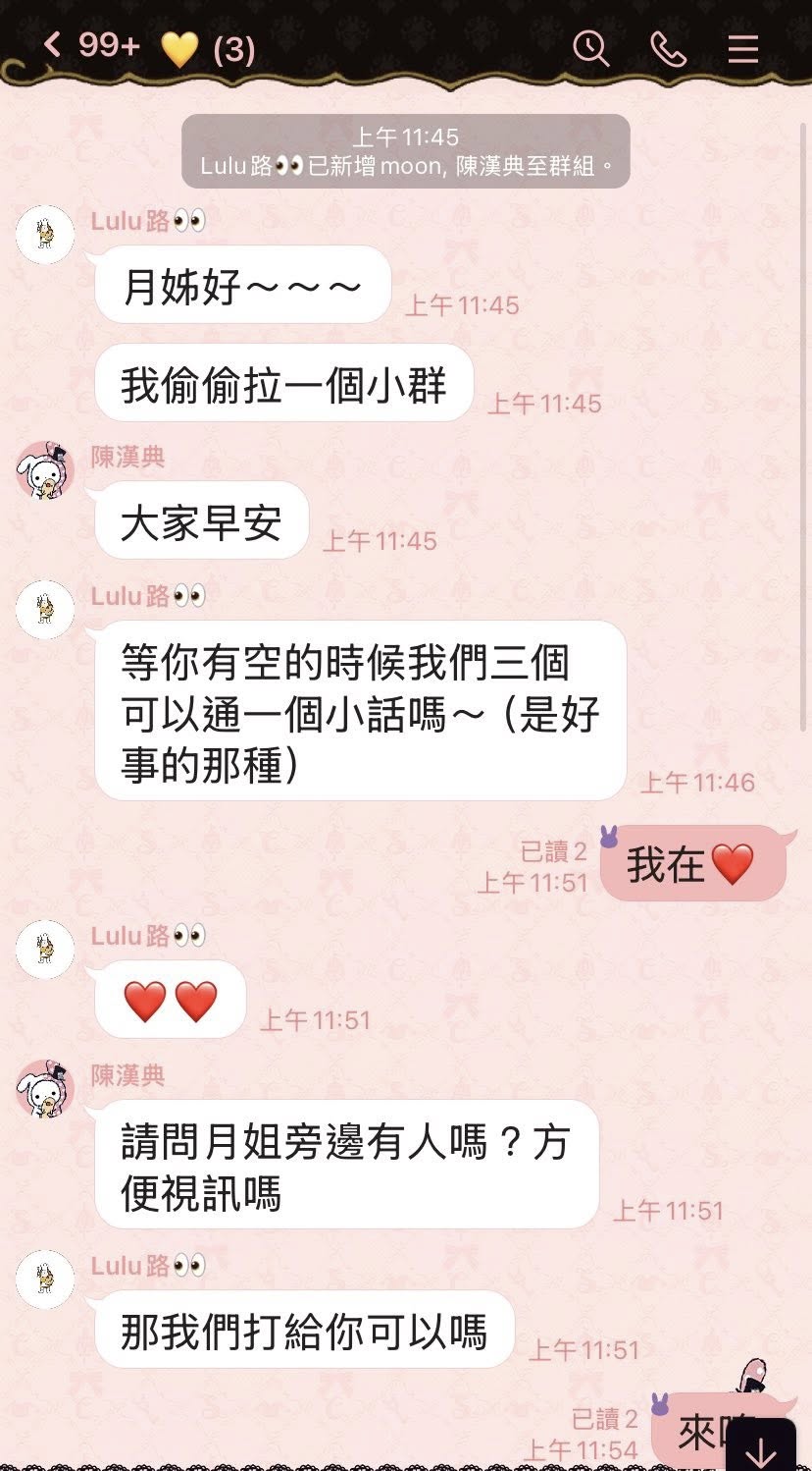 王月在脸书兴奋发文,直呼「真的太喜欢他们了!」更晒出专属小群组的对话,证明自己是最早收到喜讯的「幸运见证人」。王月透露,早在婚讯公开前一天,Lulu就主动把她和陈汉典拉进3人群组,开心地宣布「我要结婚了!」自己当下便追问「跟谁?」没想到陈汉典随即回复「是我!」王月又震惊又感动,直呼「真的太令人欢喜了!」