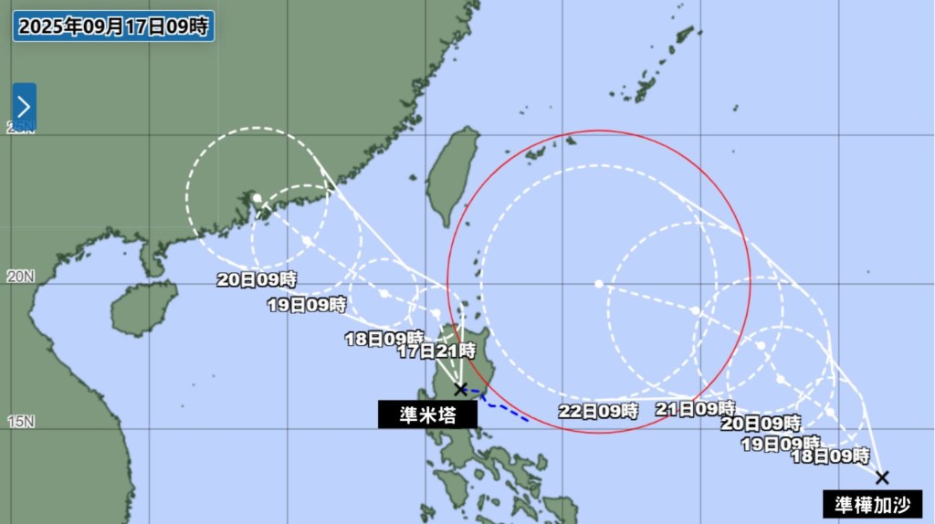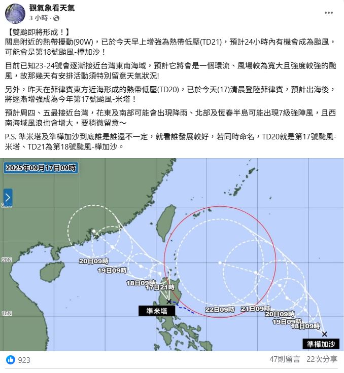 TD20的部分,今晨 (17) 已登陸菲律賓,預計出海後將逐漸增強成為颱風「米塔」。《觀氣象看天氣》指出:「預計週四、五 (18、19) 最接近台灣,花東及南部可能會出現降雨、北部及恆春半島可能出現7級強陣風,且西南海域風浪也會增大,要稍微留意~」