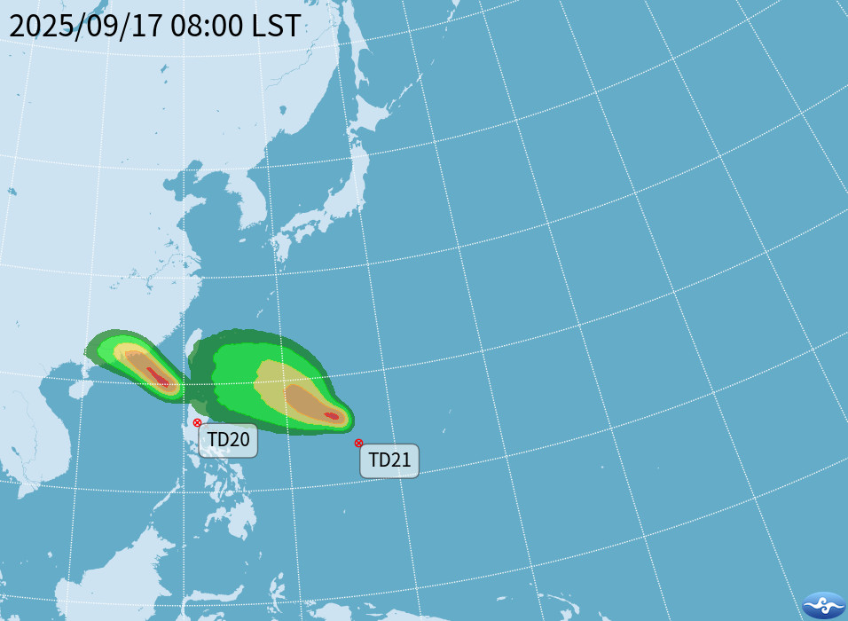 根據中央氣象署颱風消息,目前太平洋地區的熱帶擾動,皆已成為熱帶性低氣壓TD20、TD21,且都有發展為輕颱的趨勢。氣象署表示,TD20今早 (17) 中心位置在鵝鑾鼻南方600公里處;TD21在鵝鑾鼻東南東方1900公里處。氣象專家提醒,TD21預計24小時內成颱,不只環流風場寬大,強度也比較強。