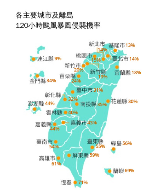 中央氣象署也公布各主要城市及離島120小時颱風暴風侵襲機率,恆春地區達71%為全台最高,其次為蘭嶼69%、高雄61%、屏東縣59%、綠島56%、台東縣55%。