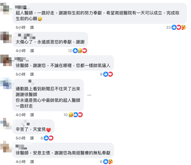近來疑似身體不適,徐超斌的臉書互動減少,死訊傳出後,網友都紅了眼睛,在他最後一篇寫著「自認為我的外表和帥字一點關係都沒有,說我是全台灣最帥的醫師,其實只是和大家説説的笑話」的貼文下方留言,「超人醫師,一路好走,謝謝禰生前的努力奉獻,希望南迴醫院有一天可以成立,完成禰生前的心願」、「徐醫師,謝謝您,不論在哪裡,您都一樣帥氣逼人」、「徐醫師,安息主懷,謝謝您為南迴醫療的無私奉獻」、「壯志未酬身先死」。