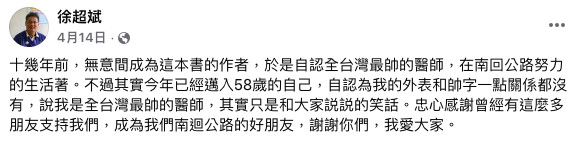 被譽為「超人醫師」的台東南迴地區醫師徐超斌,長年致力偏鄉醫療,即使近年罹患鼻咽癌第四期,依舊堅持巡診,守護病患,誰知9月18日晚間傳出病逝消息,享年58歲,許多病患與親友悲痛不已,其最後一則臉書貼文,也成為大家追思的印記。