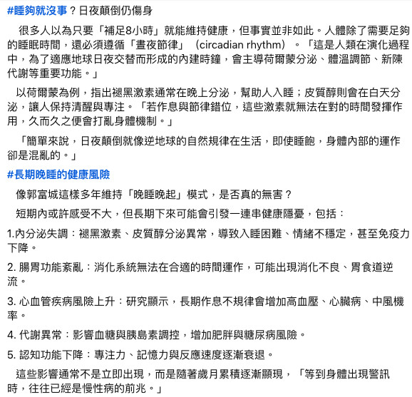 蔡依林和郭富城截然不同的作息方式,让外界好奇「睡得晚但补足时数,跟早睡早起相比,究竟对健康有什么差异?」杨聪财指出,睡眠不仅仅是长度问题,更重要的是是否符合人体的生理时钟,「即使睡眠时数足够,若日夜颠倒,长期下来,仍会对健康造成隐性伤害。」