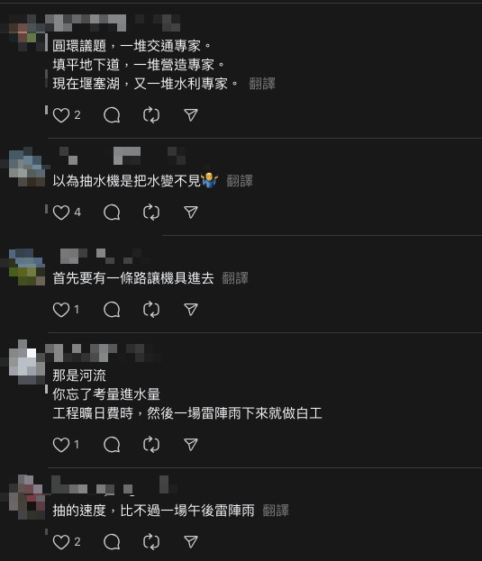 不僅如此,還有人直言「沒電怎麼抽 ?」、「先挖好地勢高到地勢低的引流道,抽水至引流道,漸漸的就會出現自動流動的水道瀑布,但這很難可能達成,因為發生點是高海拔 (氣壓低虹吸不比平地容易) ,又沒有產業道路的地方,要上去還必須會登山技能才能上去,大型機具運送幾乎不可能」、「首先要有一條路讓機具進去」、「抽的速度,比不過一場午後雷陣雨」。