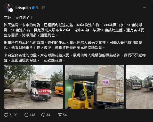 林俊宪感谢台南乡亲的援助,也特别表扬国军弟兄:「谢谢所有热心的台南乡亲,你们的爱心,我已经帮大家送到花莲。司机大哥也特别跟我说,他看到国军全力投入救灾,连物资也是由弟兄们协助卸货。来自全台各地的力量,齐心帮助花莲灾民,展现台湾人最骄傲的团结精神。我们不只送物资,更把温暖与希望,一起送进花莲。」