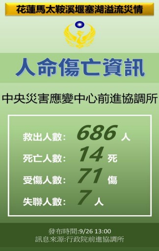 花莲马太鞍溪堰塞湖周二 (23) 下午溢流,对下游市区造成严重灾害。根据中央灾害应变中心前进协调所最新统计,截至今日 (26) 下午1点,目前已救出686人,14死、71伤,仍有7人失联。这几天陆续有热心民众捐赠物资和款项,今早来自台南的爱心也抵达花莲了!