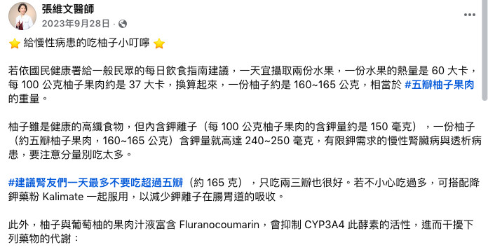 腎臟科醫師張維文在臉書表示,若依國民健康署給一般民眾的每日飲食指南建議,一天宜攝取2份水果,一份水果的熱量是60大卡,每 100公克柚子果肉約是37大卡,換算起來,一份柚子約是160至165公克,相當於5瓣柚子果肉的重量。