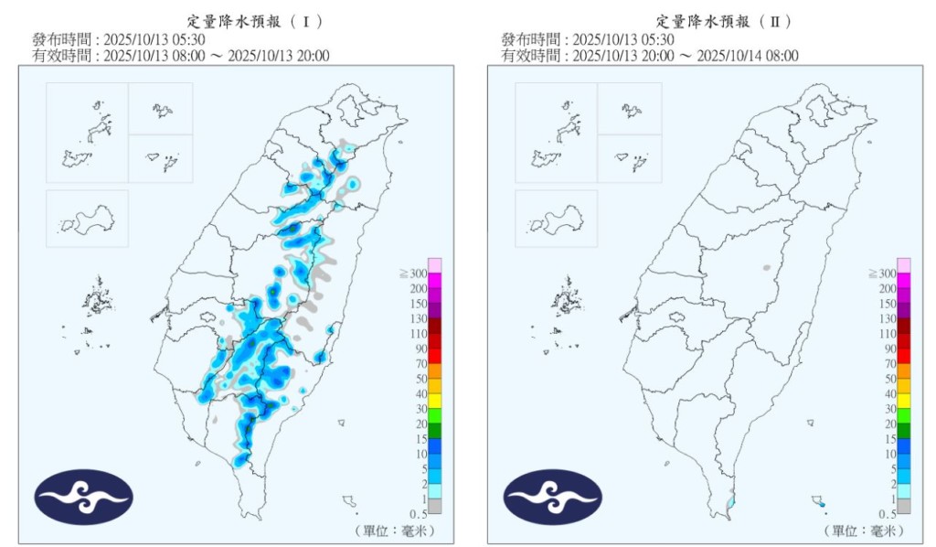 氣象署指出,今、明 (13、14) 各地大多為多雲到晴,僅東半部地區及恆春半島有零星短暫陣雨,午後嘉義以南地區及其他山區有局部短暫雷陣雨。週三到週六 (15~18) 各地大多為多雲到晴,僅基隆北海岸、東半部地區及恆春半島有零星短暫陣雨,午後其他山區有零星短暫雷陣雨。