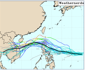吳德榮指出,最新美國系集模式 (GEFS) 模擬顯示,其系集平均 (隱含機率最高) 路徑通過呂宋島北部,進入南海,個別路徑則分散在其兩側。這代表路徑模擬有不確定性,各國模式模擬仍將持續調整,應繼續密切觀察。