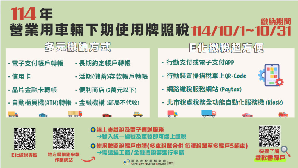 根據媒體《中天新聞網》、《三立新聞網》的報導,財政部賦稅署指出,114年營業用車輛下期使用牌照稅已於10月1日開徵,繳費期限只到本月31日,提醒車主務必於繳納期限內完成繳稅,若尚未收到繳款書或遺失繳款書,應儘速向車籍所在地的地方稅稽徵機關或派駐監理機關櫃檯申請補發。