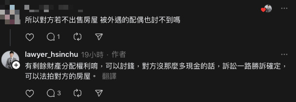 有網友好奇地問「對方若不出售房屋,被外遇的配偶也討不到嗎?」黃韋儒解釋,有剩餘財產分配權利,可以討錢,對方沒那麼多現金的話,訴訟一路勝訴確定,可以法拍對方的房屋。
