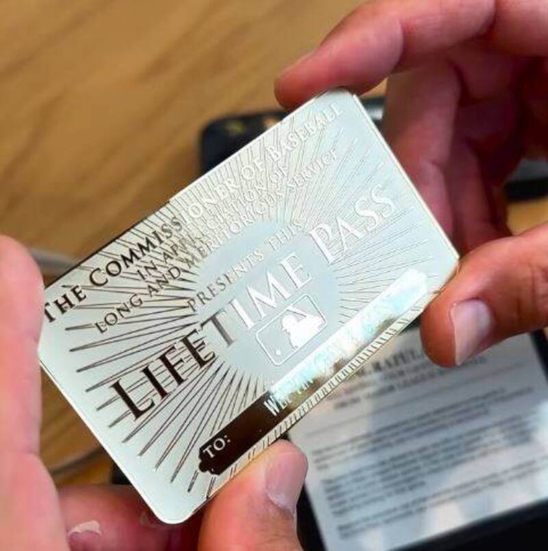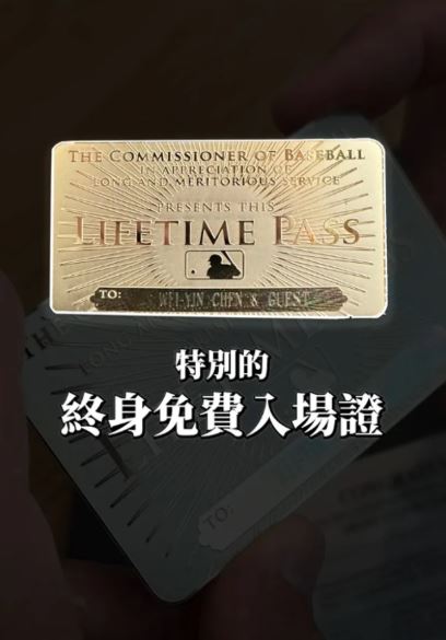 陈伟殷说明,这张卡片其实是MLB特别的终身免费入场证,也被称为「黄金票」或「白金票」,持有人可以终身免费进入所有MLB球场观看例行赛,还能携带一名宾客同行,是一张传说级别的卡片。