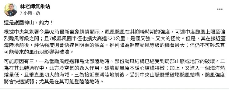 林得恩博士今早 (8) 透過臉書粉絲專頁分析,鳳凰颱風在巔峰時期可達中颱上限至強颱等級之間,「且7級暴風圈半徑也擴大高達320公里,是個又強、又大的怪物。」不過鳳凰接近台灣陸地前後就會遇上剋星,「評估強度則會快速且明顯的減弱,推判降為輕度颱風等級的機會最大」。