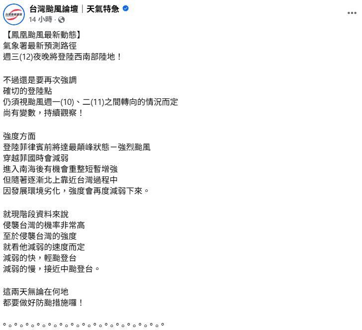 「就現階段資料來說,侵襲台灣的機率非常高」,《台灣颱風論壇|天氣特急》從氣象署預測路徑推估,下週三 (12) 晚上鳳凰「將登陸西南部陸地」。不過確切登陸點仍受下週一、二 (10、11) 轉向情況影響,《台灣颱風論壇|天氣特急》強調:「尚有變數,持續觀察!」