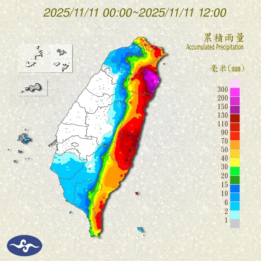 氣象署說明,今天 (11) 受颱風外圍環流及東北季風影響,基隆北海岸、大台北、東半部地區及恆春半島請防大雨及豪雨,尤其東半部山區有局部豪雨等級以上發生的機率,週三隨颱風接近,南部地區也有大雨或局部豪雨,週四颱風減弱並逐漸遠離,除桃園以北地區仍有局部大雨發生,其他地區雨勢趨緩。