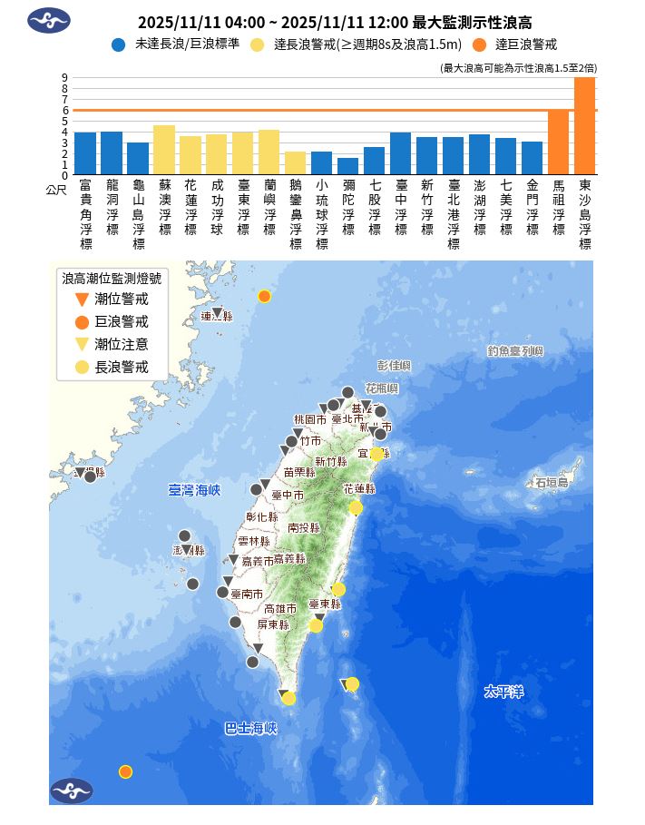 氣象署浪高潮位監測顯示,馬祖浮標及東沙島浮標已達巨浪警戒。今天 (11) 各沿海、離島局部地區易有平均風6級以上或陣風8級以上的強風,其中台中至雲林沿海及澎湖、馬祖有平均風9級以上或陣風11級以上發生的機率;各沿海浪高可達3至5米,尤其東南部、南部及澎湖海面浪高可以來到6米左右或以上,基隆北海岸、東半部 (含蘭嶼、綠島) 、西南部、恆春半島沿海及澎湖有長浪發生的機率,請避免前往海邊活動。