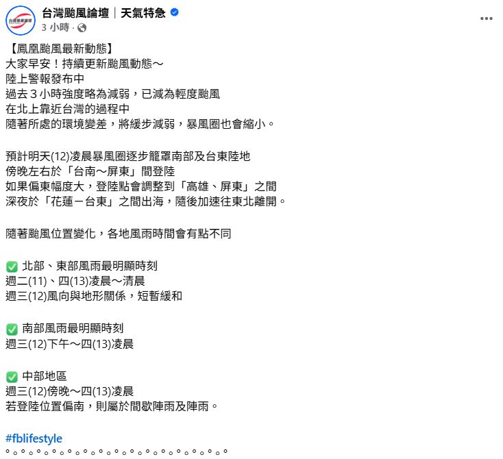 翻攝自臉書 (台灣颱風論壇|天氣特急) ,下同