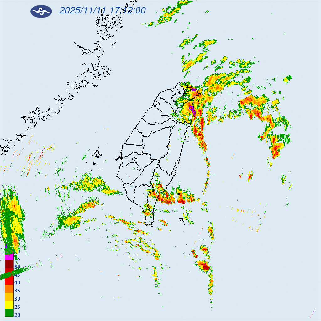 24小時累積雨量預測則顯示,今天 (11) 晚上8點到明天 (12) 晚上8點,台東縣山區達停班停課標準。