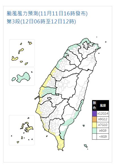 根據氣象署今天 (11) 下午4點發佈風力預測,明天 (12) 上午6時至中午12點,風力有機會達停班課標準 (平均風達7級以上或陣風達10級以上) 的地區為: