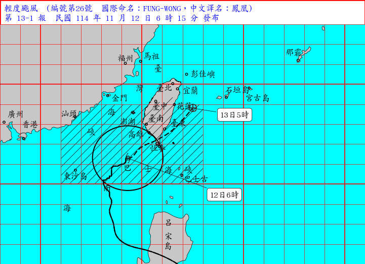 根據《東森新聞》報導,中央氣象署表示,「鳳凰」的中心今 (12) 晚間8點就會登陸台灣高屏地區,並在穿越台灣尾巴後,明 (13) 日上午8點從東部海面離開,緊接著而來的就是東北季風增強,中部以北及東北部天氣轉涼。