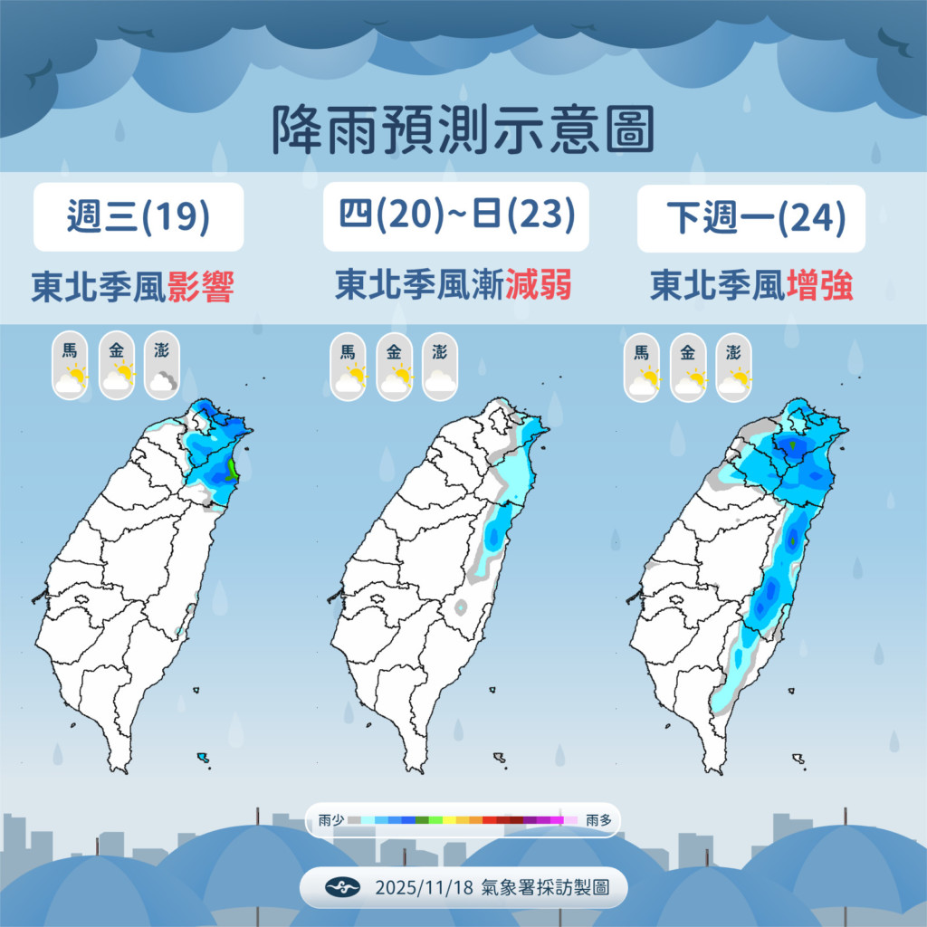 到了周末 (22、23) 東北季風減弱,各地氣溫才會逐漸回升,不過氣象署預估下周一 (24) 又有一波東北季風報到,屆時北台又會再轉涼,迎風面降雨機率也會略提高。
