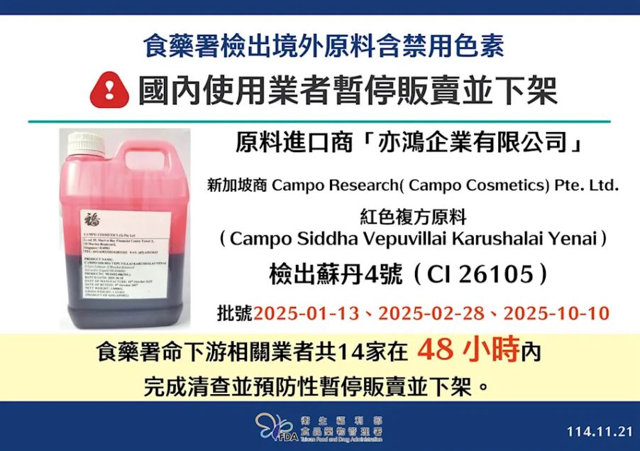 根据媒体《TVBS》、《ETtoday新闻云》的报导,台湾首见化粧品检出禁用色素苏丹4号,食药署在24日公布相关产品检验结果及违规产品清单,共有12家业者、18项产品检出苏丹红,问题商品遍及7个县市。食药署研判业者是使用到来自新加坡的违法原料,且检验浓度结果「极高」,进口原料的台湾原料进口商被认定明显是掺伪假冒的诈欺行为。