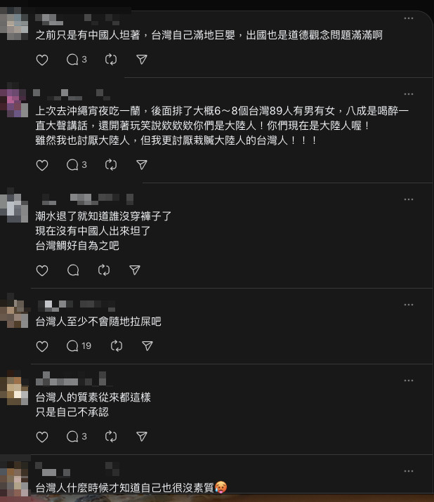 貼文曝光後,大家紛紛嘲諷:「之前只是有中國人坦著,台灣自己滿地巨嬰,出國也是道德觀念問題滿滿啊」、「潮水退了就知道誰沒穿褲子了!現在沒有中國人出來坦了!台灣鯛好自為之吧」、「台灣人的質素從來都這樣,只是自己不承認」、「老實說,我幾個月前去沖繩,最搞事的還真的都是台灣人,講話有夠大聲,搭車也插隊」、「這幾年去日韓多次,遇到最吵的都是台灣人呢」、「你說的沒錯,我時常進出日本跟韓國,常常碰到台灣人就是這樣的德行」。