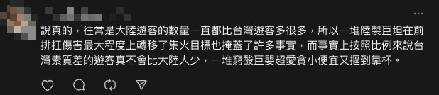 此外,也有人分析,往常中國遊客的數量一直都比台灣遊客多很多,所以一堆「中國製巨坦在前排扛傷害」,最大程度上轉移集火目標,也掩蓋許多事實,而事實上,按照比例來說,台灣素質差的遊客真不會比中國人少,「一堆窮酸巨嬰超愛貪小便宜,又摳到X杯。」