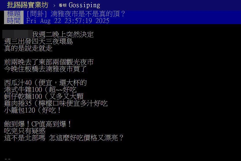 有位住在南部的鄉民日前環島時,來到位於新北市板橋區的「湳雅夜市 (板橋觀光夜市) 」,飽餐一頓後發現也不會花太多錢。原PO買大杯西瓜汁只花40元,吃了好吃的百元牛雜、100元料多又大顆的蚵仔乾麵、35元多汁雞肉捲和120元的小籠包。總共花費395元,吃得非常滿足:「CP值高到爆!」