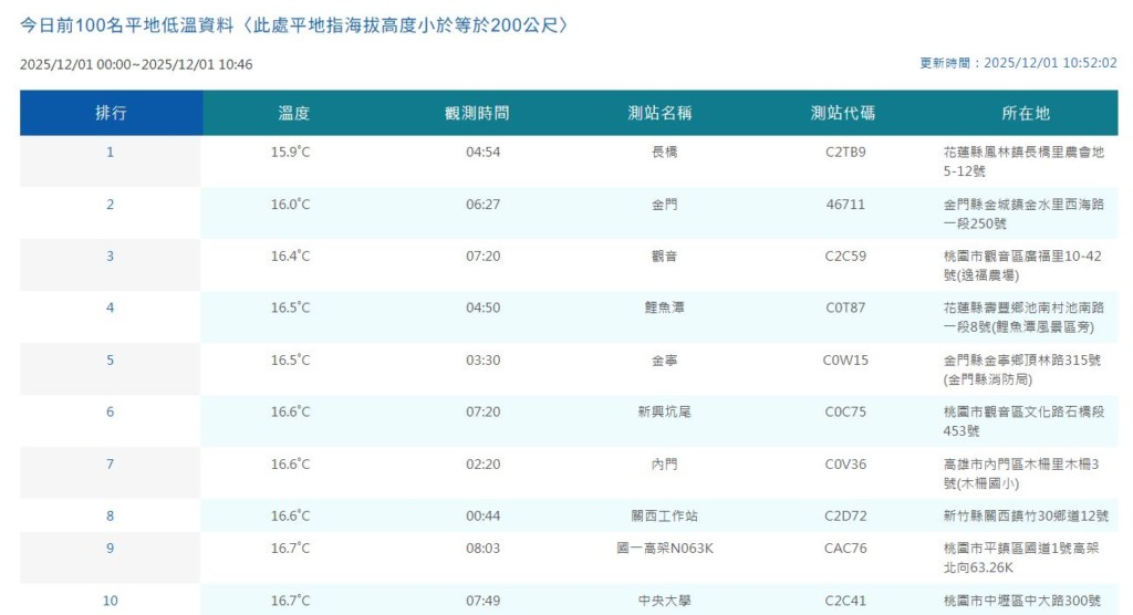 根據中央氣象署統計,今日 (1) 平地最低溫落在花蓮縣鳳林鎮的15.9度。接下來因為有一波冷空氣南下,不只山區很冷,連平地氣溫都會再降!中央大學大氣科學系兼任副教授吳德榮指出,下波東北季風增強後,平地最低氣溫約可降至12度。