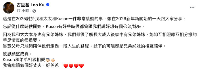 在貼文最後,古巨基感動地說「感恩願望成真,Kuson和弟弟相親相愛。我會繼續做個好丈夫、好爸爸!」