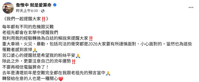 詹惟中21日在臉書粉專再度發文示警,每年都有不同的危機跟災難,老祖先會在玄學中指示,他則利用自身經驗轉換為白話的解說來提醒大家,2026年務必要謹慎面對重大車禍、火災、暴動,以及包括司法的衝突。