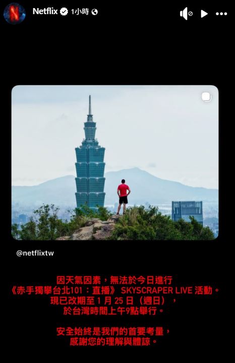 Netflix今早 (24) 透過官方臉書粉絲專頁等平台宣布:「因天氣因素,我們無法於今日進行《赤手獨攀台北101:直播》 Skyscraper Live 活動。」Netflix強調「安全」始終是首要考量,此項壯舉預定改期至明天 (25) 台灣時間上午9點舉行。
