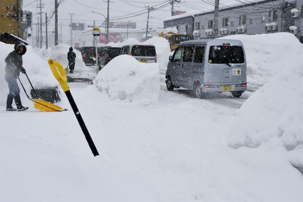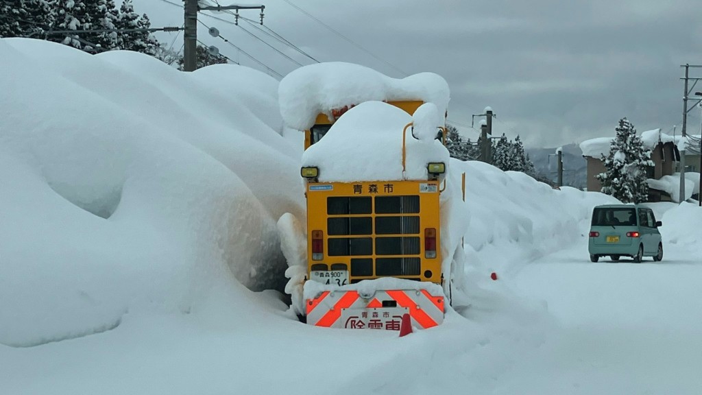 日本政府已派遣自衛隊協助北部地區清除積雪,並提醒居民避免單獨進行除雪作業,儘管青森市地面積雪已降至1.6公尺以下,但交通仍未完全恢復,道路兩側積雪如牆般高聳,行走困難。