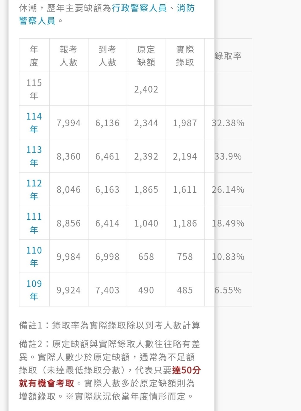 去年2025年警察五合一考試統計資料顯示,⼀般警察⼈員考試 (不限警校畢業,一般民眾也能考) 有7994人報考、6136人到考。根據《TVBS新聞網》報導,原定缺額2,344人,最終錄取人數為1987人、錄取率32.38%,也就是說,成績達50分以上即有機會考進。公職補習班高點萬文老師表示,少子化影響,近年警察錄取率上升,2026年的缺額比去年多58人、再創新高,鼓勵有相關志願的考生把握機會。