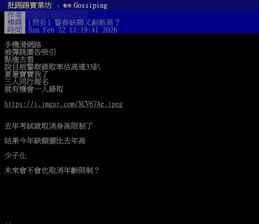 保家衛國是你從小的夢想嗎?如果想當警察,不一定要警校畢業,報考一般警察特考也有機會錄取,而且近來缺額愈來愈多。一位鄉民看到手機跳出的廣告,「說目前警察錄取率估高達33趴,夏暑 (嚇死) 寶寶我了!三人同行報名,就有機會一人錄取。」今年缺額又增加,不過網友們卻表示越來越少人願意從警。