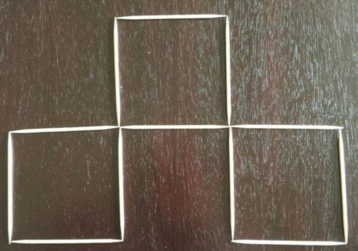 最近在網路上流傳一個腦筋急轉彎,是由一位叫Brian Hoang的網友所想出來的。快來看看你是否有辦法解開謎題吧!下面這個用12根牙籤所組成的4個正方形,你必須在3步以內把它變成3個正方形,前提你不可以折斷或改變牙籤的形狀,並且不能把2個牙籤疊在同一邊,3個正方形必須相等大,你可以用任何形式去移動牙籤,但是所有正方形必須是完整的不能有開口。