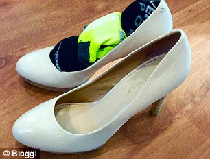 鞋子的部分,可以把比較輕便、耐壓的鞋用橡皮筋綑住,節省空間;另外,高跟鞋的部分,還可以把襪子放在鞋內,善加利用空間的同時,還可以確保鞋子不會壓壞。
