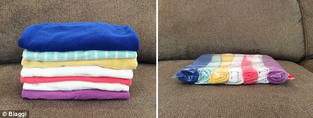 首先瑞秋從衣服開始著手,用捲衣服的方式節省空間,也不會折壞衣服,並把衣服放進真空壓縮袋裡。